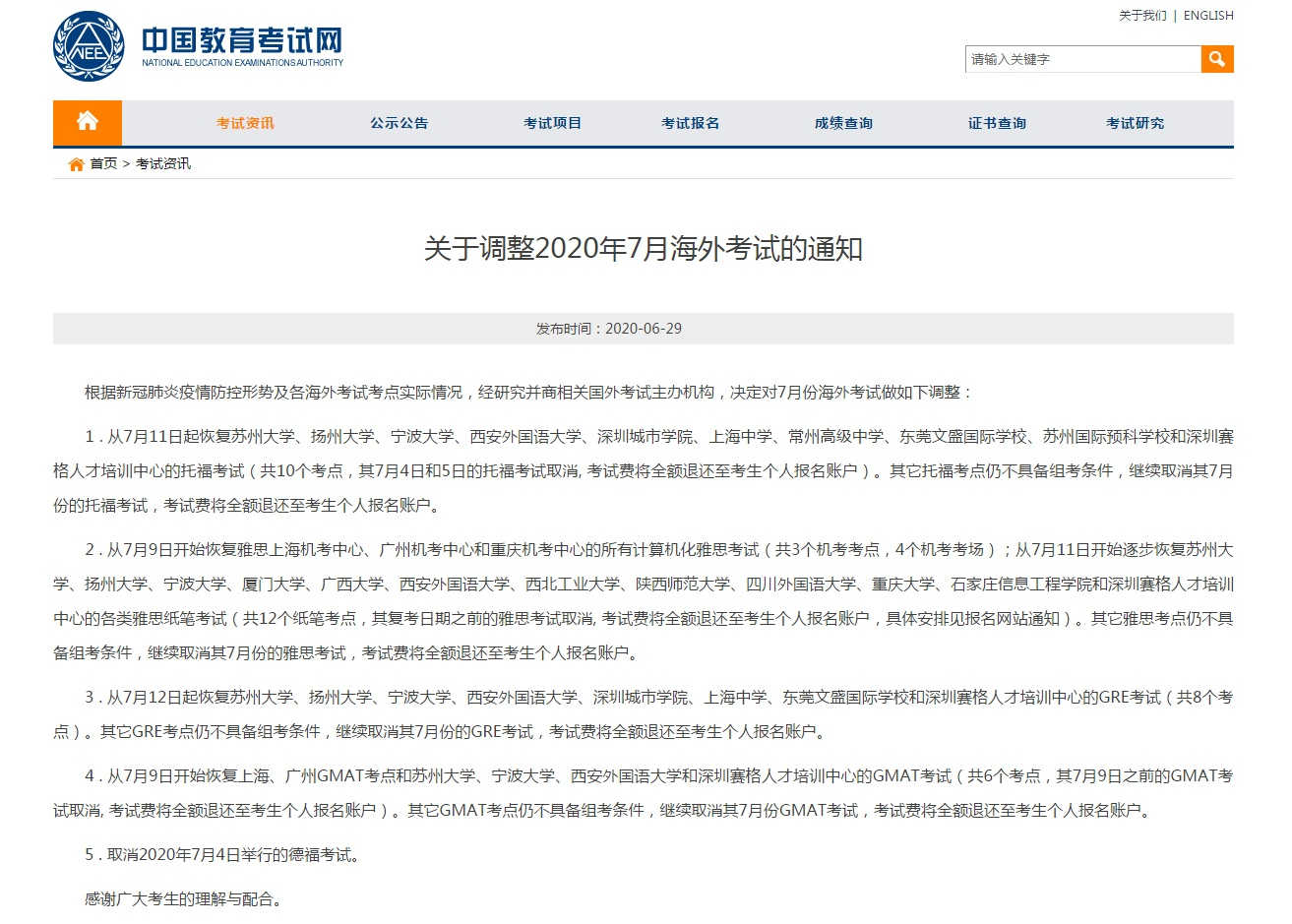◆据教育部考试中心消息,根据新冠肺炎疫情防控形势及各海外考试考点实际情况,经研究并商相关国外考试主办机构,决定7月份恢复部分雅思托福考试。