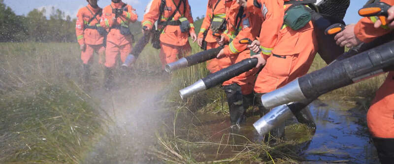 守卫着祖国的“大粮仓”,东方红森林消防大队背负着沉甸甸的责任。“有些大队打火上山打,而我们打火上湿地”,东方红森林消防大队五中队中队长骆斌介绍道。在东方红镇的林区中,湿地面积达到4.6万公顷。每年的7月到9月为当地的防火期,由于温度较高,易造成森林火灾,而湿地中的枯草一旦燃烧起来,蔓延速度可达到每小时60公里左右。因此,湿地成为骆斌和战友们进行日常巡护和扑火作战的“主战场”。