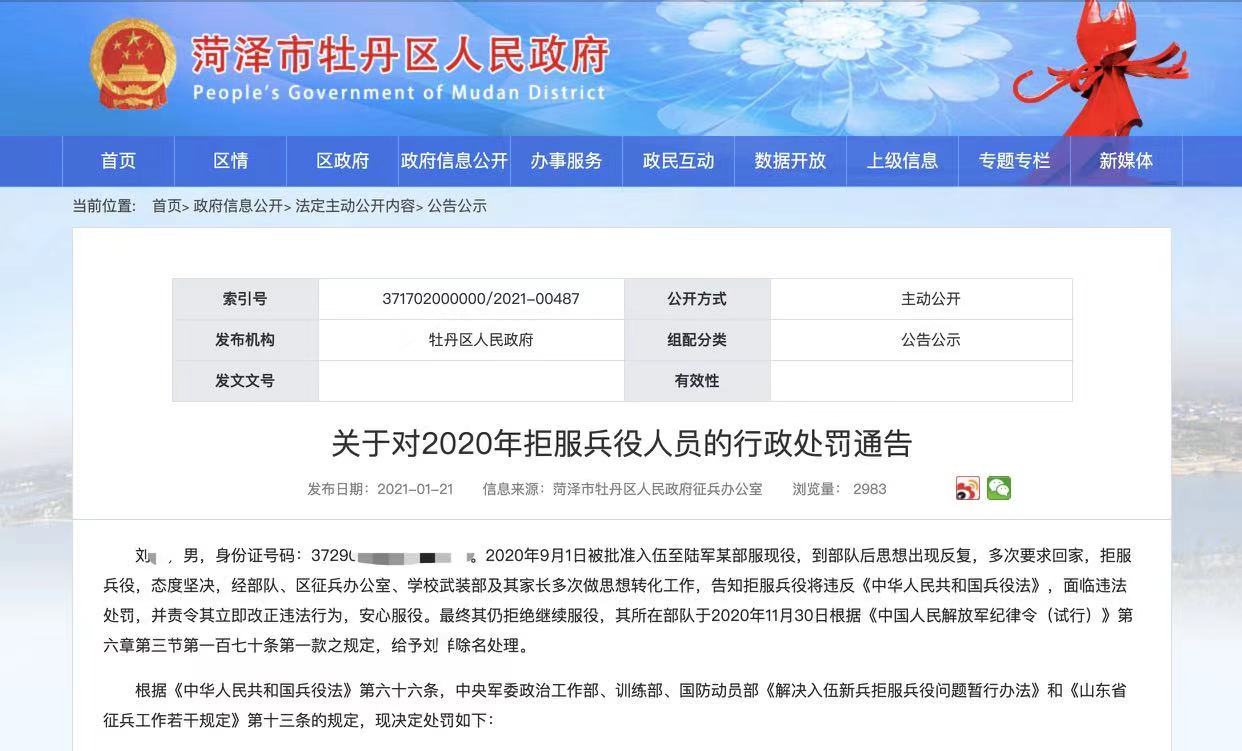 2021年1月21日,菏泽市牡丹区政府官网发布一则“关于对2020年拒服兵役人员的行政处罚通告”。通告称,刘某2020年9月1日被批准入伍至陆军某部服现役,到部队后思想出现反复,多次要求回家,拒服兵役,态度坚决。经部队、区征兵办公室、学校武装部及其家长多次做思想转化工作,告知拒服兵役将违反《中华人民共和国兵役法》,面临违法处罚,并责令其立即改正违法行为,安心服役。最终刘某仍拒绝继续服役,其所在部队根据相关规定,给予刘某除名处理。