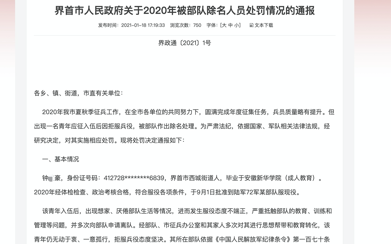 1月18日,安徽界首市政府官网发布一则“关于2020年被部队除名人员处罚情况的通报”,拒服兵役的青年钟某某被处罚。