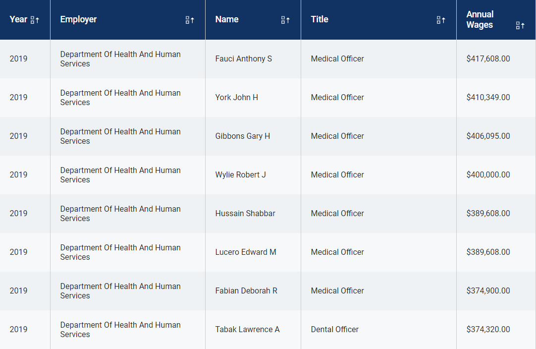 据OpenTheBooks统计,联邦雇员中收入最高的前7位都是卫生官员