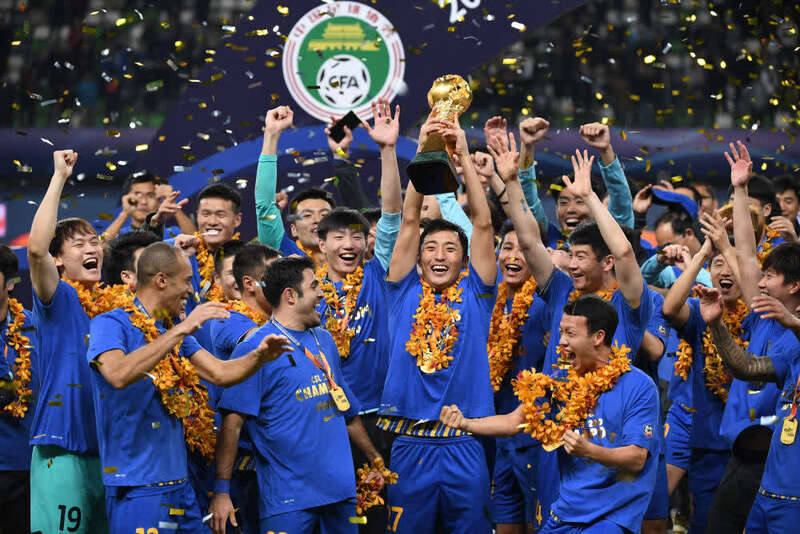2020年11月12日,江苏苏宁队2:1击败卫冕冠军广州恒大淘宝队,两回合2:1夺得队史首个中超冠军。新华社记者李博摄