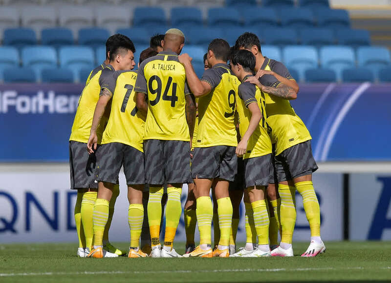 11月28日,在卡塔尔首都多哈进行的2020赛季亚洲足球冠军联赛东亚区G组小组赛中,广州恒大队首发阵容在比赛前相互鼓励。新华社发(尼库摄)
