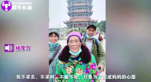 收获关注的同时,也有人质疑他们在炒作。对于这些质疑声,杨厚万向记者表示他并不在乎,“我不求名,不求利,不偷不抢,只是为了完成母亲的心愿,让妈妈开心而已。我开直播的目的是希望让更多人关心自己的父母,真正了解父母内心的想法。”