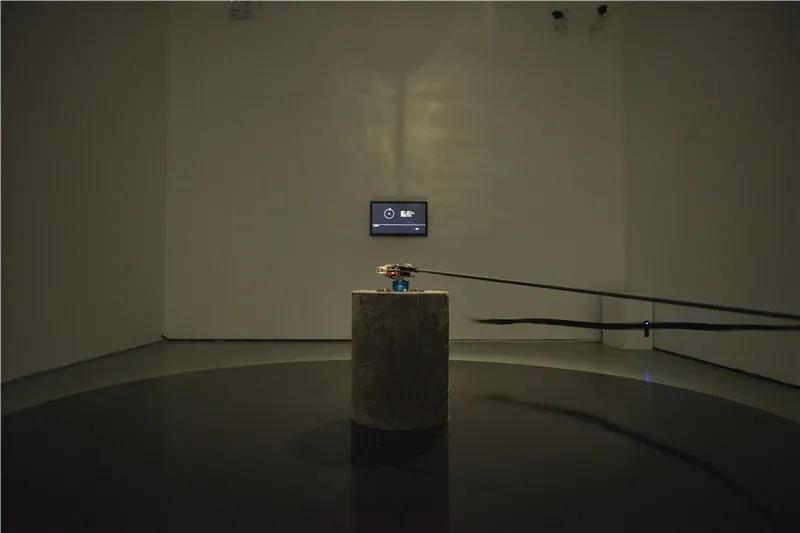 这一展厅还展示了作品《生成的线索》,郑达用机器捕捉自己运行鼠标的轨迹,然后再用机器来呈现,其实就是在数据去模拟自我(即艺术家本人),这件作品从2014年创作开始一直延续到现在,已经运行了6年的时间,在现场导览的时候,郑达还讲了作品的一个小彩蛋,就是当观众大声说话的时候,作品中的“鼠标”会因为声音受大惊吓,出现暂停的动作,非常的有意思。