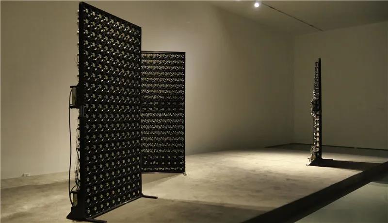 最后一个展厅展示了作品《生理反应1》,郑达用1200个电脑机枪内的散热风扇组成屏风后置换到美术馆展厅内,并在展厅搭建了一个台子,让这件作品像一位舞者一样,郑达在作品中上传了一个简单的“遗传算法”,让这些风扇的转动在程序控制下自主运行,观众进入后,不仅能看到风扇转动形成的图案,还能听到其声音、感受风的触感。