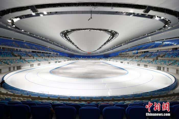 2021年1月28日,已完成制冰的国家速滑馆。北京2022年冬奥会标志性场馆——国家速滑馆近日完成速滑赛道的首次制冰,具备了迎接测试赛的条件。 中新社记者 富田 摄