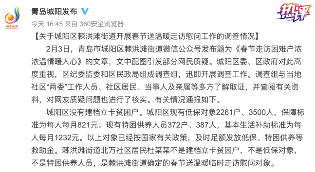 2月3日,青岛市城阳区棘洪滩街道公号发布一篇领导春节走访困难户的文章,本来是一则“送温暖”的新闻,却因配图中走访人家里摆放的几瓶高档酒和茶叶,引发网民质疑。