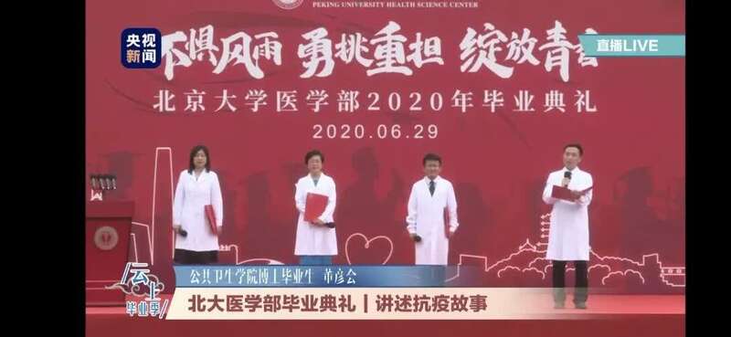 董彦会(右一)在北京大学医学部毕业典礼上讲述抗疫故事