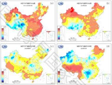 △2020年全国冬(a)、春(b)、夏(c)、秋(d)季平均气温距平分布(单位:°C)