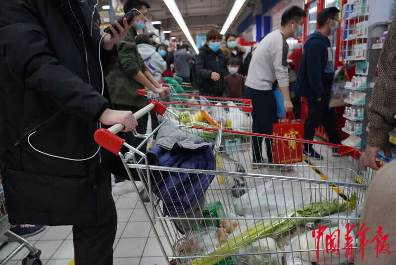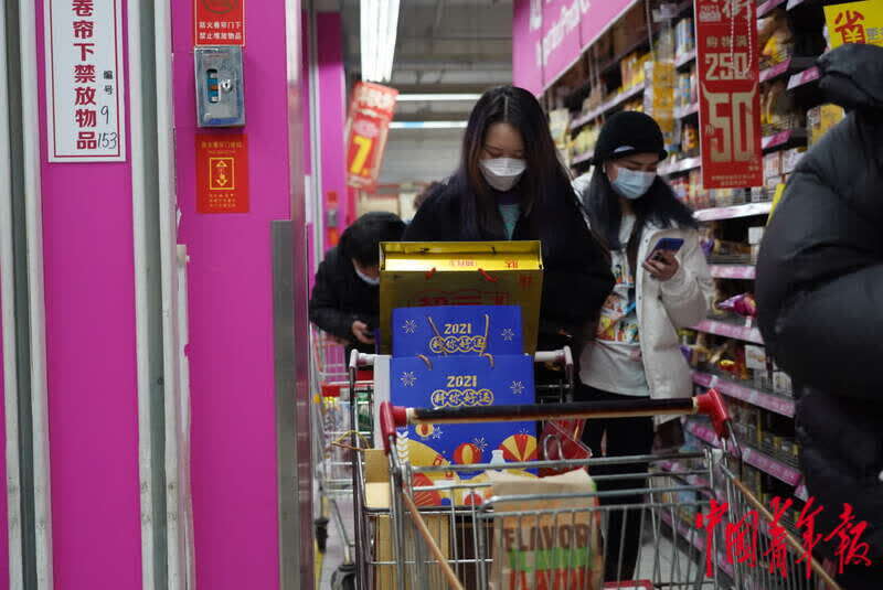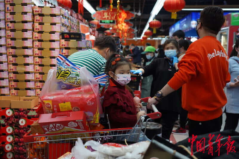 2月11日,北京市天通苑龙德广场家乐福,居民在超市采购年货。当日是农历除夕,很多居民响应北京市政府就地过年的号召,在异乡过年。售货员告诉记者,今年除夕的人流量比去年高出不少。中青报·中青网记者 王嘉兴/摄