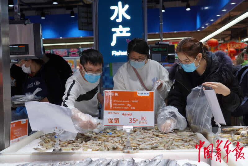 2月11日,北京市天通苑龙德广场家乐福,采购虾的顾客。一些年轻顾客是第一次在外过年,也是第一次自己操持年夜饭、采购食材,不少人请教售货员阿姨如何选择更新鲜的食材,售货员阿姨也很热心地教他们。中青报·中青网记者 王嘉兴/摄
