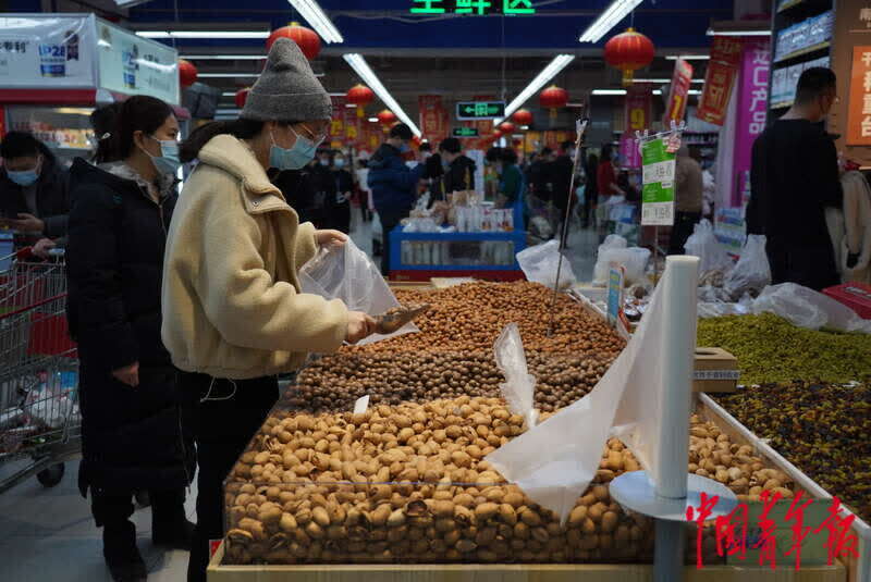 2月11日,北京市天通苑龙德广场家乐福,采购坚果的年轻人。她告诉记者,往年在家都是父母负责采购年货,今年,她也依样购买坚果、酥糖等。中青报·中青网记者 王嘉兴/摄