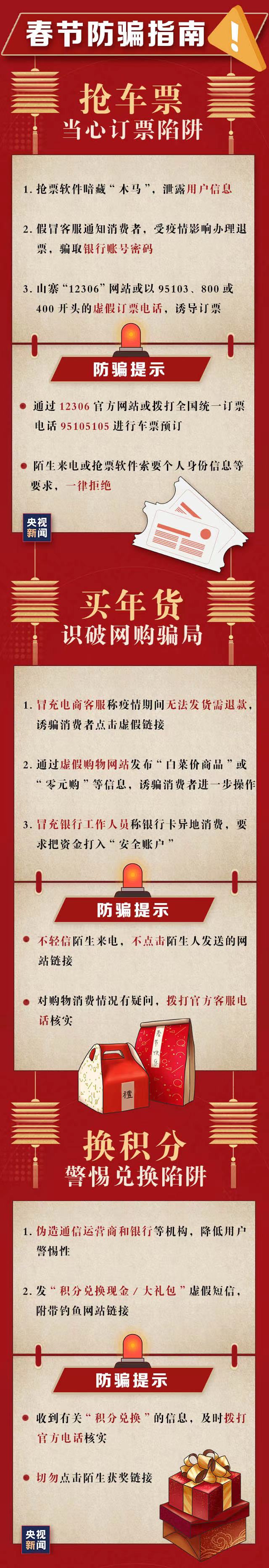除了抢红包的各种“套路”,春节期间抢车票、购年货、换积分……这些活动的网络诈骗也防不胜防,快收好这份春节防骗指南: