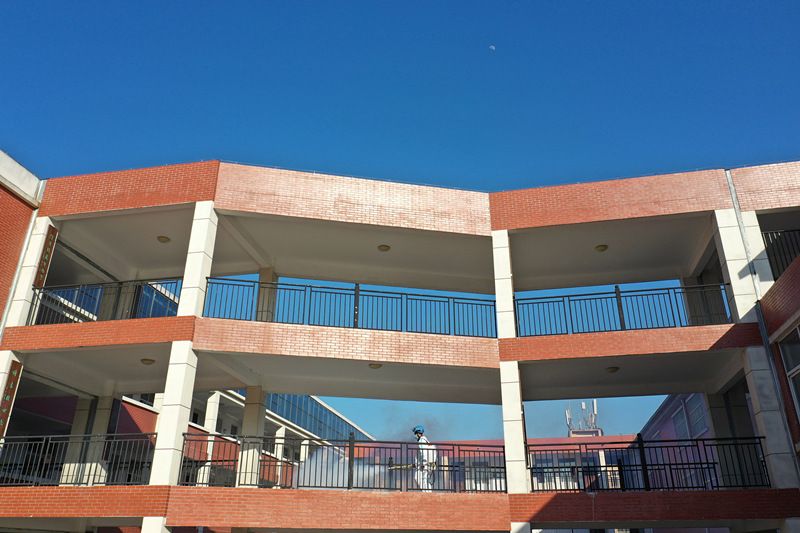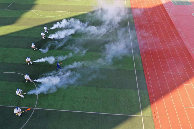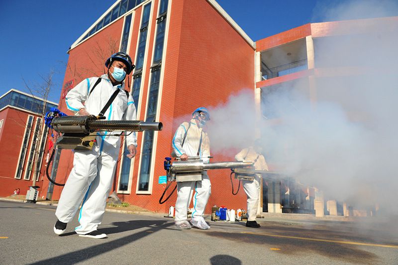 2021年2月21日,江苏徐州,蓝天救援队志愿者在睢宁县新城区学校进行消杀作业。 新学年开学前夕,该县教育部门联合蓝天救援队,对所有中小学校、幼儿园进行消杀作业,营造健康的校园学习、工作环境。