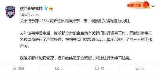 陕西长安竞技足球俱乐部在说明中写道:去年该事件发生后,俱乐部全力配合当地有关部门进行调查工作,同时对涉事三名教练员进行了严肃处理。在相关部门结果确认后,俱乐部终止了与三人的工作合同。我俱乐部将加强管理,提升教练员职业素质,对违法行为绝不姑息。