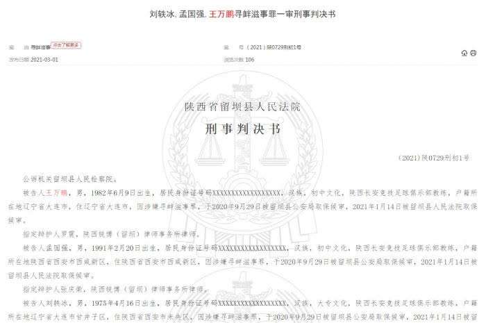中国裁判文书网日前登出了陕西省留坝县人民法院的一则刑事判决书。判决书显示,陕西长安竞技足球俱乐部教练王万鹏以及孟国强、刘轶冰因犯寻衅滋事罪,分别被判缓刑。其中,王万鹏为前中国男足球员。