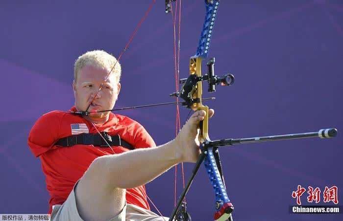 当地时间2012年9月3日,美国选手马特-斯塔兹曼参加伦敦残奥会男子射箭比赛。