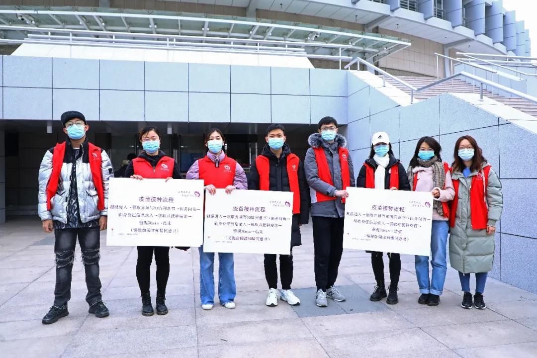 红色、紫色、蓝色的防护服、身着不同服装的志愿者身影或守护在岗位上,或穿梭在排队的队伍中,为前来接种的同学提示接种流程步骤和注意事项。