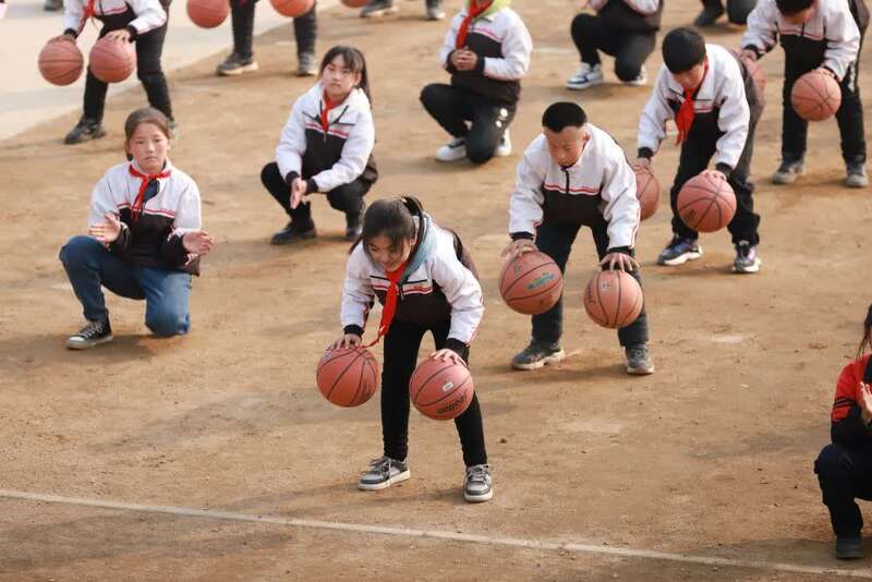 每天上午九点半,河北省滦州市油榨镇王官营小学都会传出整齐的拍球声。体育老师王效丰站在操场边,600多个篮球在学生们手中,随着动感音乐弹起又落下。
