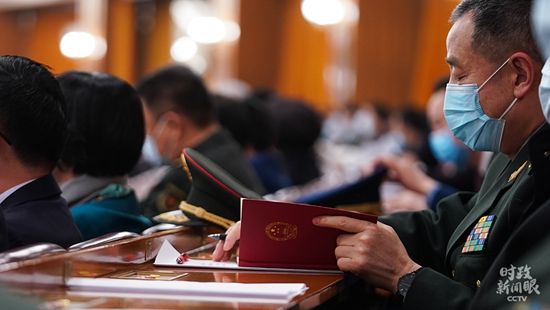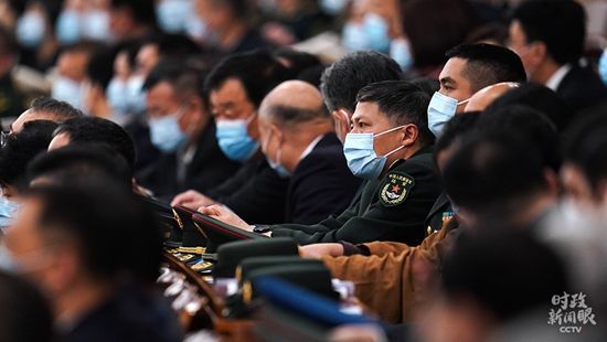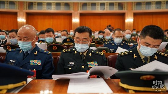 △十三届全国人大四次会议第二次全体会议现场的解放军代表(总台国广记者李晋拍摄)