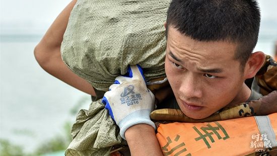 △2020年7月底,巢湖流域进入紧急防汛期。中国人民解放军73021部队铁骑先锋营430名指战员奔赴一线,扛沙袋加固巢湖大堤。