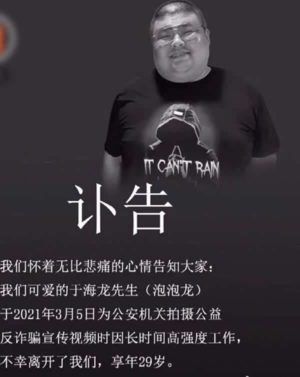 3月10日,有网友发布讣告称,“泡泡龙”于海龙先生于2021年3月5日为公安机关拍摄公益反诈骗宣传视频时因为长时间高强度工作,不幸离世,享年29岁。
