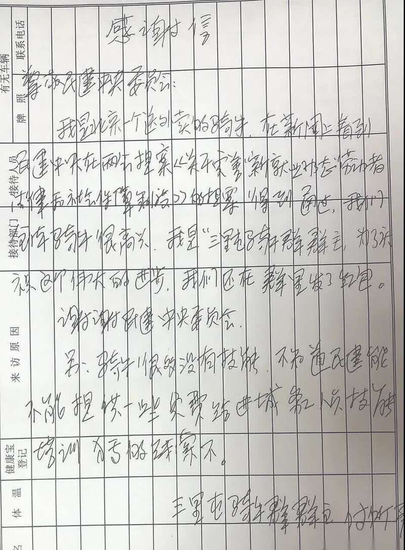 保安称里面正在开会,请他将诉求写在纸上。由于临时找不到纸,付所青就在访客登记表上写了一封感谢信: