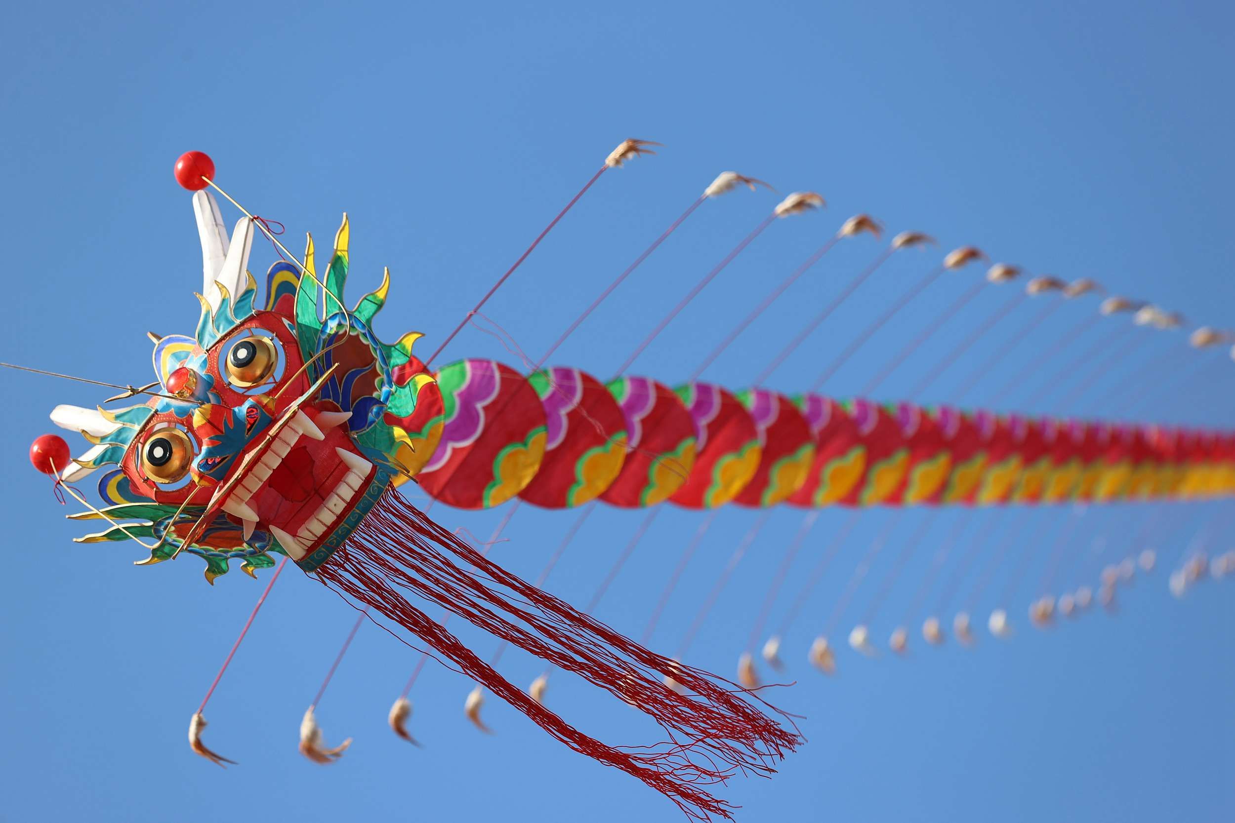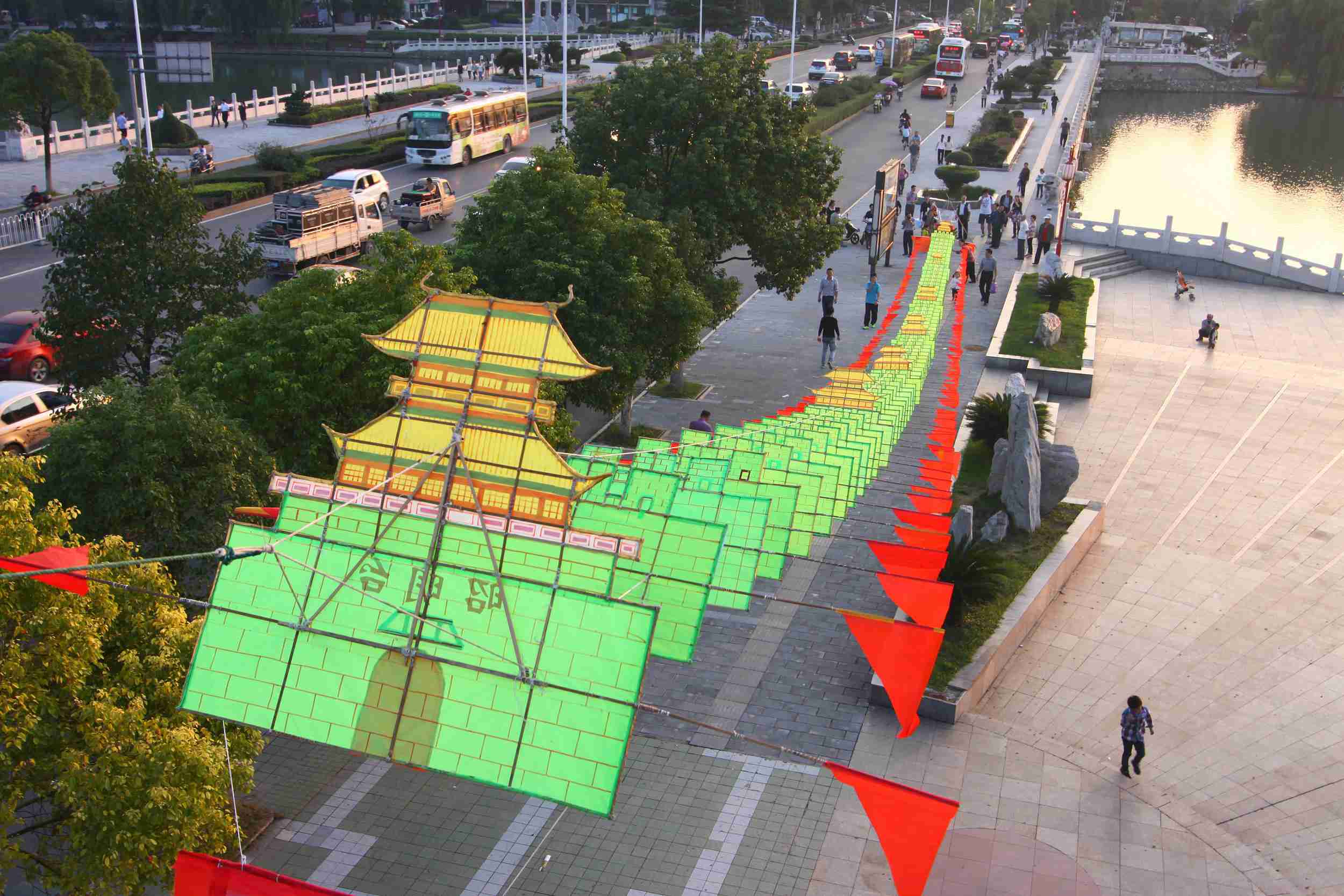 2014年9月29日,湖北省襄阳市,市民围观一只长达65米的龙头风筝。 据风筝主人吴先生介绍,他为庆祝建国65周年,专门制作了这条65米巨型龙头风筝,龙身采用古城墙造型,寓意襄阳古城与国同庆。