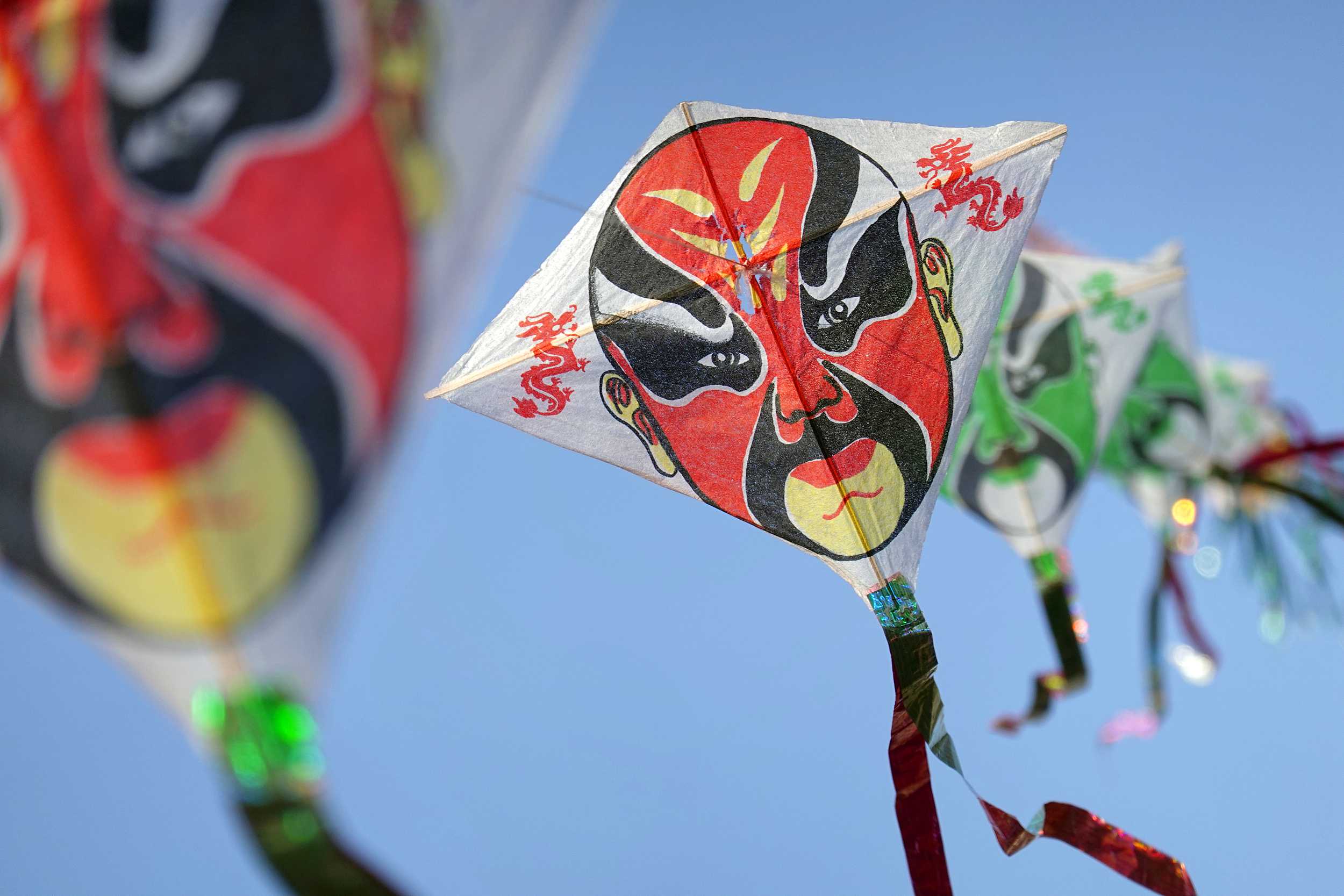 2021年2月15日,在北京后海景区,一只京剧脸谱风筝迎风摇曳。