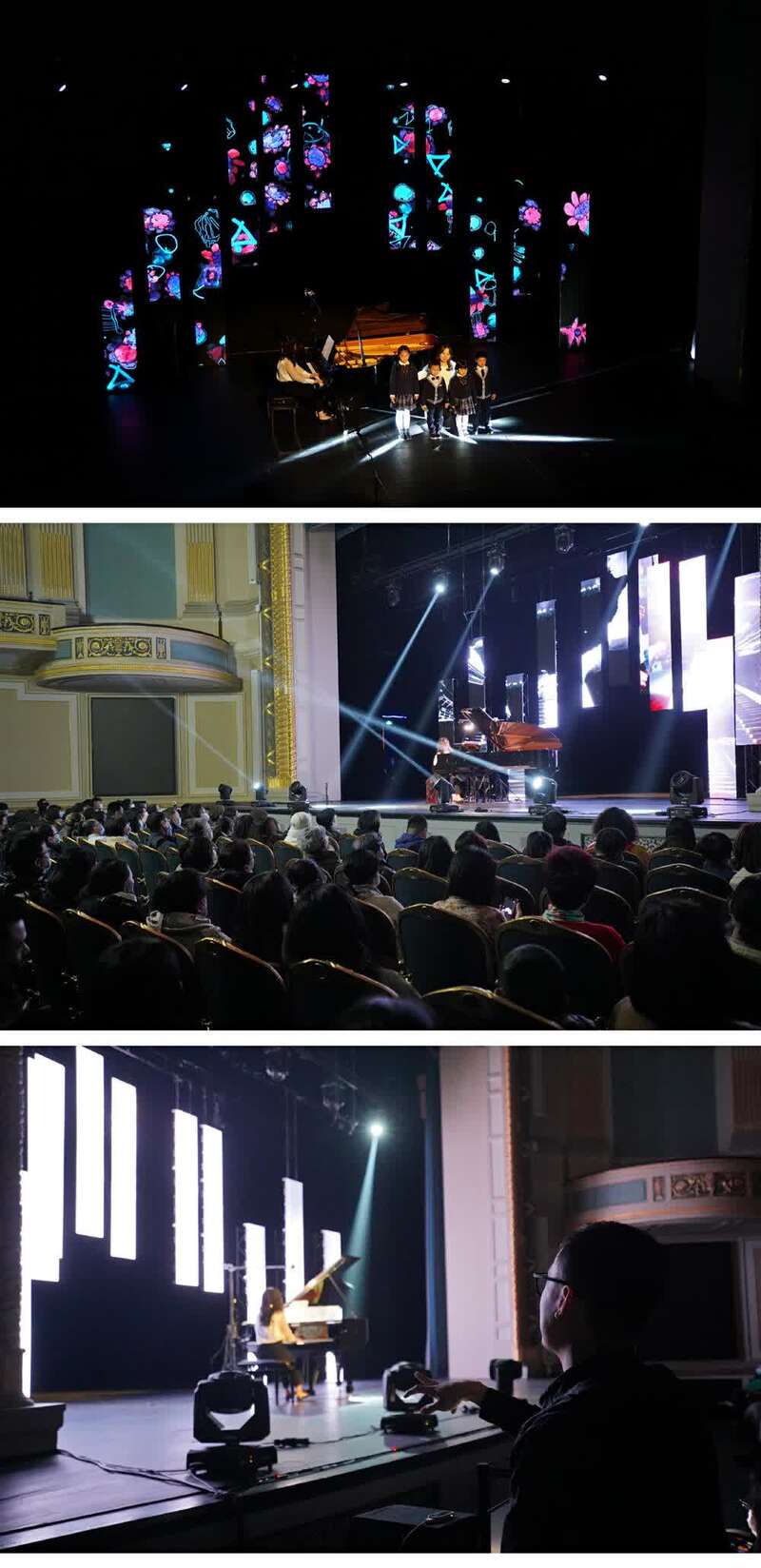 邵青作品《诗画三帧》,灵感来源于诗歌和绘画。作品采用电子音乐与钢琴音色对话的互动形式,并在新媒体手段的综合辅助下呈现一种全方位的动态感知结构。徐志博的《际空之响》,分为“光”“影”“象”三个部分,使用钢琴与交互电子音乐,构成声音的叙事线索,并延伸至各种新媒体艺术元素。