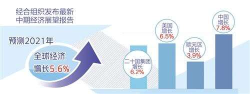 报告指出,得益于部分国家的疫情应对举措和财政支持,以及疫苗接种工作的展开,全球经济前景明显改善。经合组织预测,2021年二十国集团经济增长6.2%,美国经济增长6.5%,欧元区经济增长3.9%。亚洲国家中,中国、日本、韩国分别增长7.8%、2.7%、3.3%。