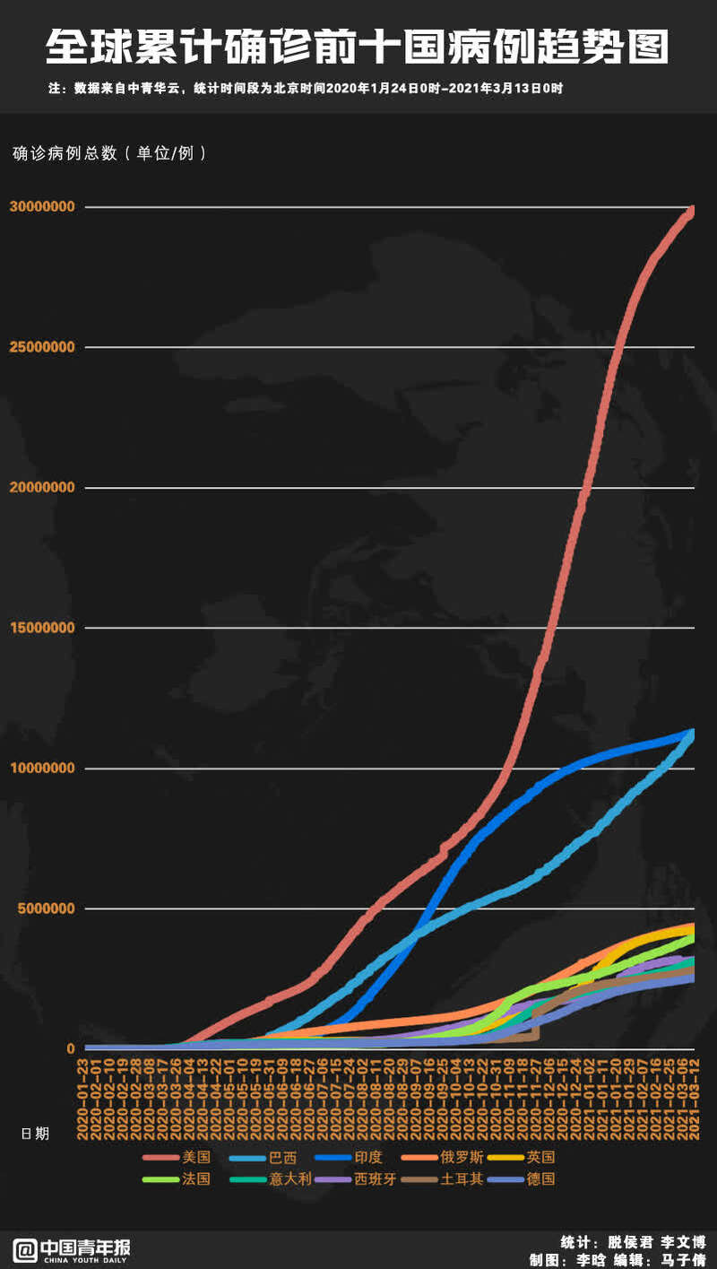 世卫组织统计数据显示,截至北京时间3月14日9时,全球累计新冠确诊病例超过1.18亿例,累计死亡超过263万例。在截至3月13日的一周里,全球新增确诊病例超过310万例,新增死亡约6.2万例,两项指标均高于上周。
