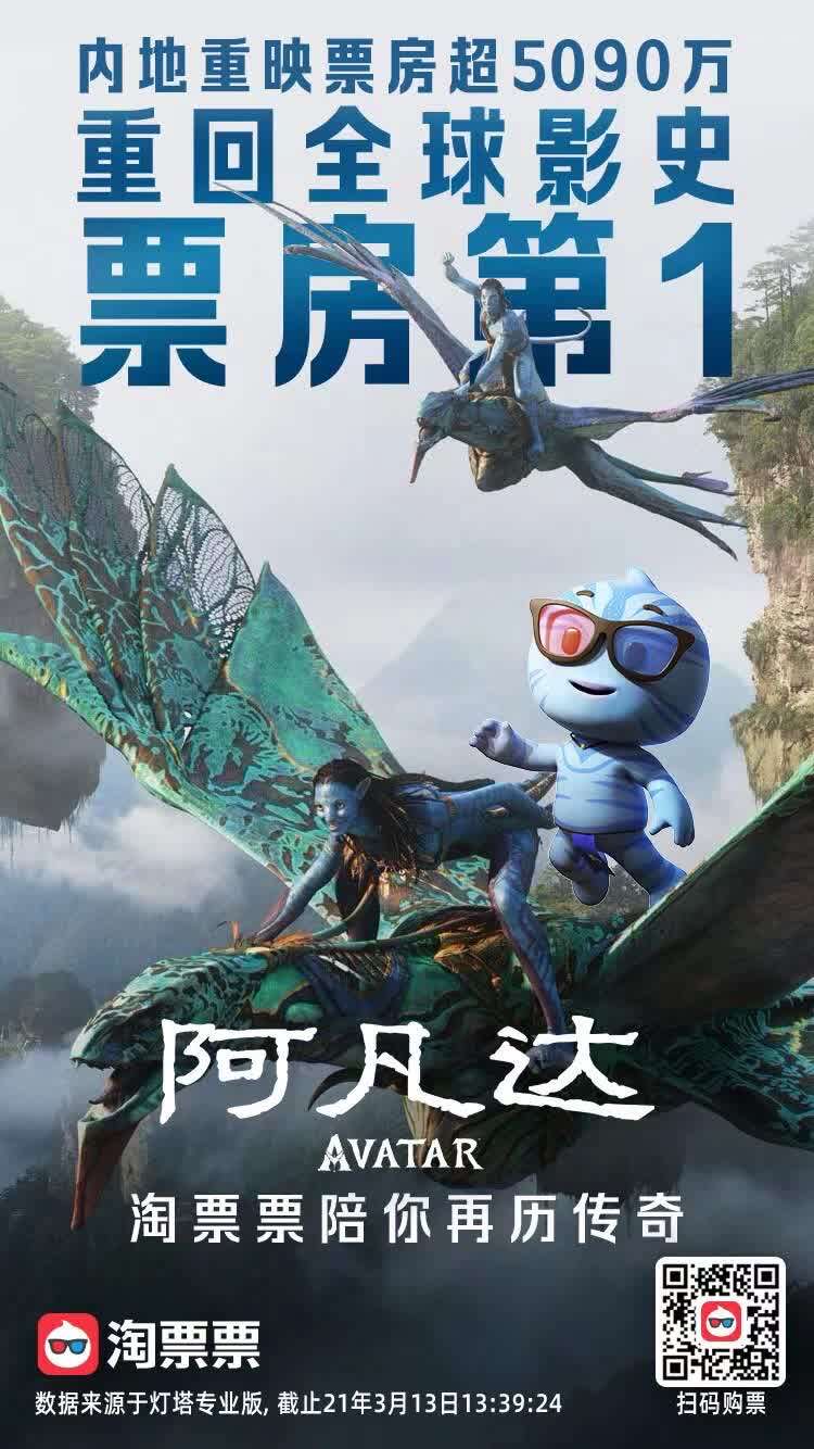 截至3月13日13时许,电影《阿凡达》内地重映票房突破5090万,反超《复仇者联盟4: 终局之战》,重回全球影史票房冠军宝座