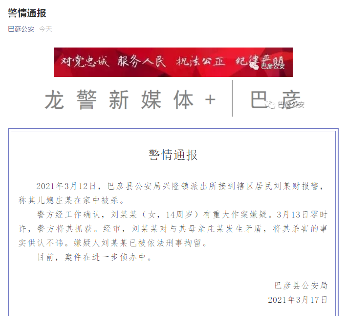 警方:黑龙江14岁女生与母亲发生矛盾将其杀害 已被刑拘