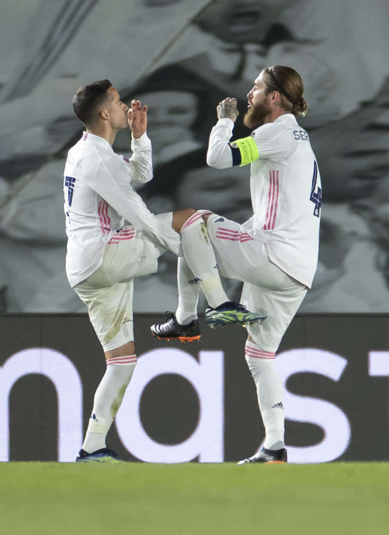 图为3月16日,皇家马德里队球员拉莫斯(右)与队友巴斯克斯在比赛中庆祝进球。新华社记者 孟鼎博 摄
