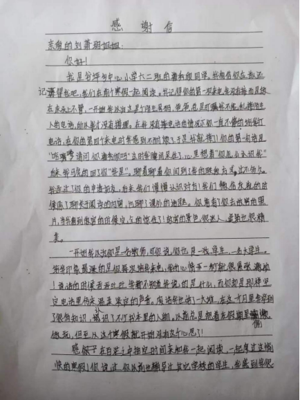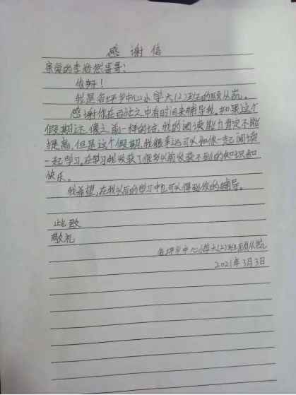 在寒假,航空航天大学的张俊杰与从江县谷坪乡中心小学的麦欣雨结成对子,2021年3月的一天,欣雨小妹妹给大哥哥写来了一封感谢信。