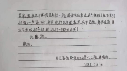 小同学和大同学之间的书信往来中,透露着真诚,美好,热情。“虽然这个假期,只有短短的一个多月,但是这一份温暖,将成为我们一生获益的力量。”