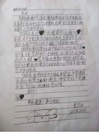 张俊杰也给麦雨欣回了封信,“我很感动,也有些愧疚,最初只是想完成一次任务,但最终却被她感动了,也感染了。每次雨欣都能够按时完成我布置的作业,字迹工整,我能做的也就是尽力批改得认真一些。”