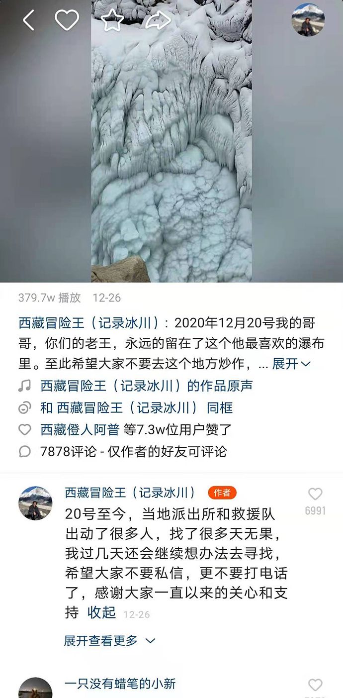 王相军落水失踪6天后,2020年12月26日,他的弟弟王龙在网上公布了王相军冰川遇险的消息,引发人们关注。王龙称,哥哥永远留在了最喜欢的瀑布里。