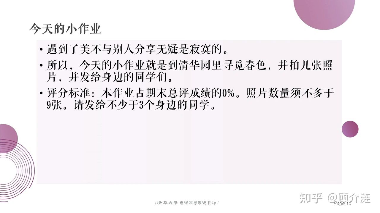 课程介绍里,“顾介涟”写道:“在竞争激烈的清华大学,同学们感到日益增长的学习压力,大量同学也处于心理亚健康状态”,而这门课的目的就是“提升同学们的幸福感”。课程第一周的主题定为“积极心理学”;在“一点五课”的课件里,贴有几张清华园梅花的照片,他布置了“作业”——拍摄清华园的春色发给身边的同学,“忙碌的一天又要结束了,沉浸于案首的你,是否注意到了洋溢着的春色呢?”