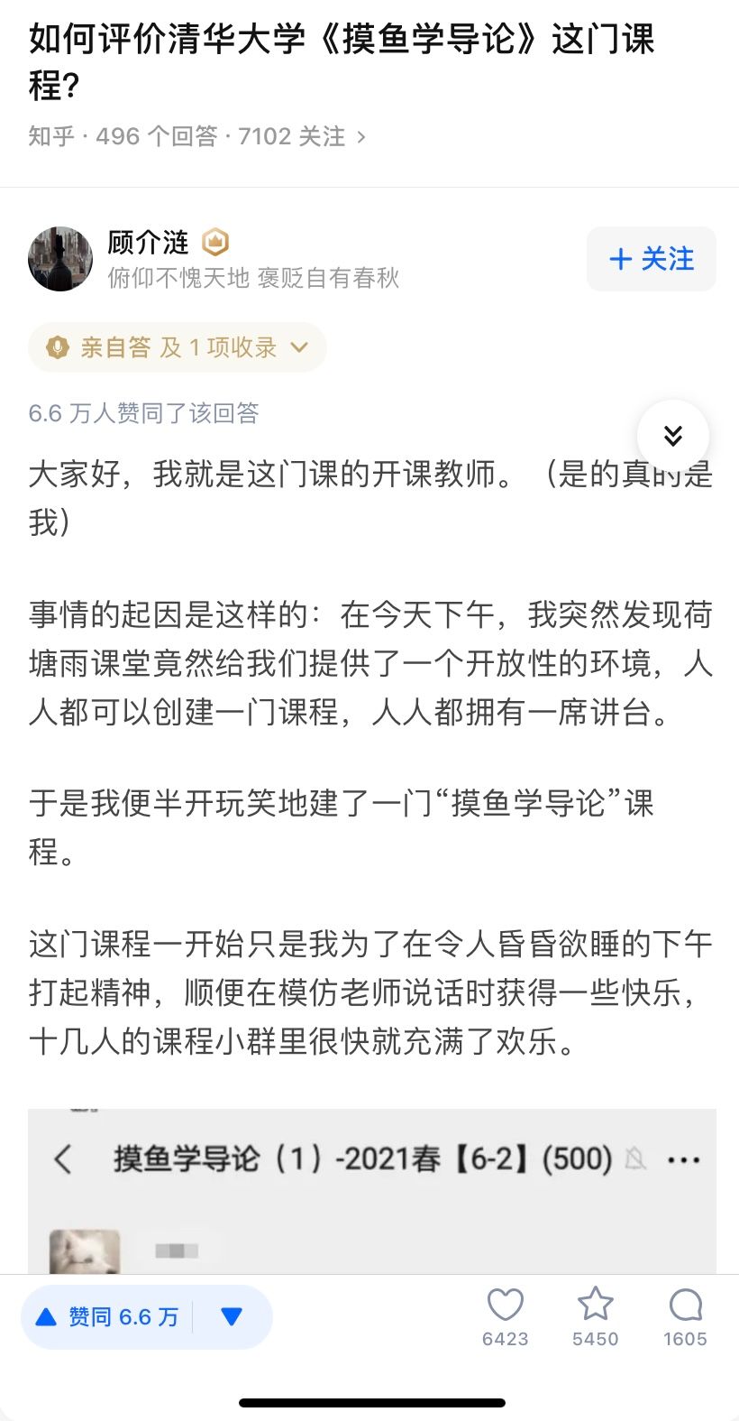 最初,《摸鱼学导论》的确是“周三下午令人昏睡的课堂上开的小小玩笑”,ID为“顾介涟”的用户在知乎上这样介绍。他坦承,自己是开课“教师”,是清华大学一名大一学生。