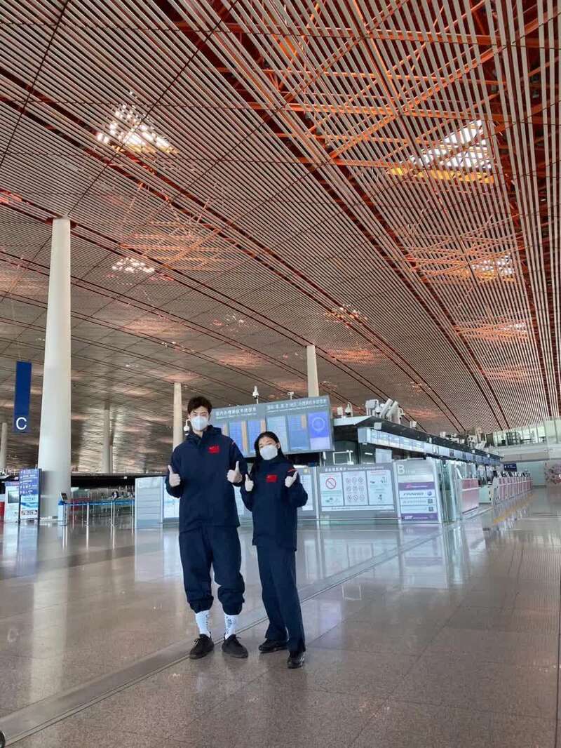 王诗玥/柳鑫宇(左)在机场准备前往斯德哥尔摩