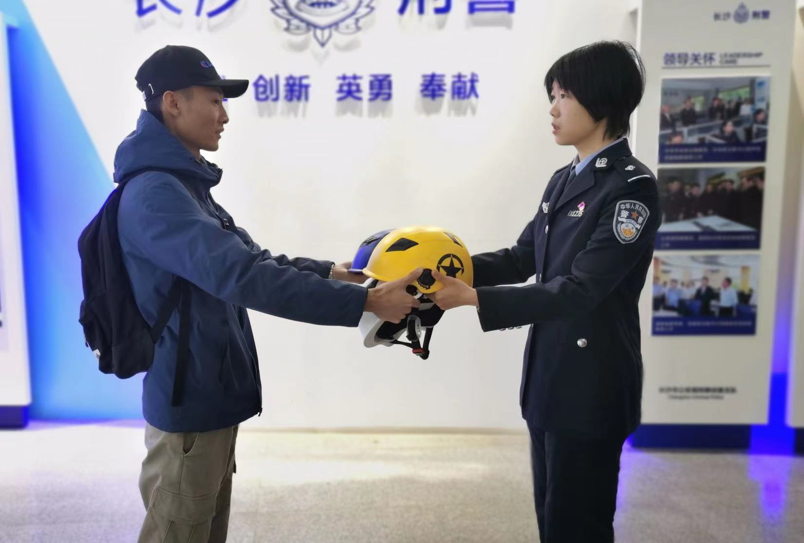 长沙公安民警向相关企业返还被盗头盔。