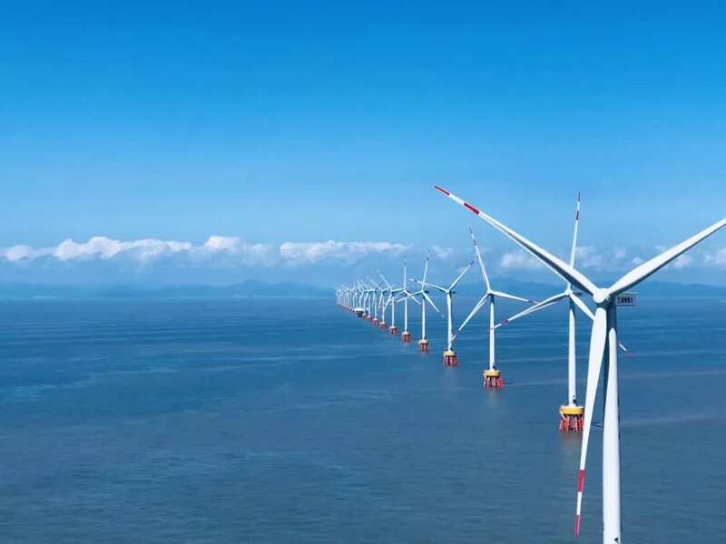 ▲在春风中,在碧海蓝天的唯美风光里,国家能源集团国电电力舟山海上风电公司普陀风电场风电机组在海平面上源源不断地输送着绿色能源。
