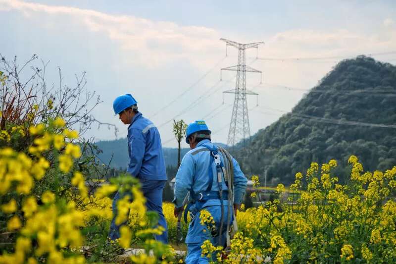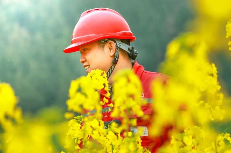 ▲南方电网云南曲靖罗平供电局板桥供电所工作人员在油菜花海中开展抢修工作。