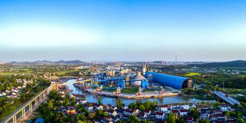 ▲中国建材集团所属湖州南方物流有限公司在浙江长兴通过封闭皮带长廊连接多个水泥生产基地的大型内河物流码头,天蓝、水清、草绿。
