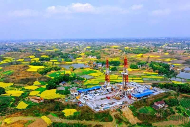 ▲在我国首个深层页岩气田—— 中国石化威荣页岩气田,钻井铁塔矗立在五彩大地上。