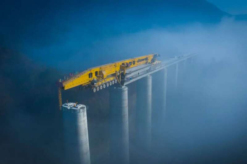 ▲在广西扶绥县静谧的群山中,中铁十一局汉江重工制造的高铁运架一体机犹如云起龙骧划破长空,在近40米的高桥上平稳地进行高铁箱梁铺架作业。该工程属南崇铁路其中一段,建成后将与越南的同登至河内铁路相连,经河内与万象-曼谷-吉隆坡-新加坡相通。