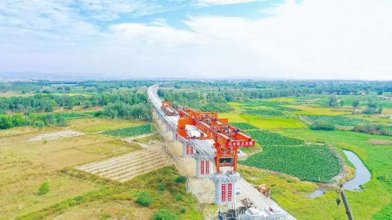 ▲中国中铁北京局900吨箱梁架桥机正在一片绿色中架设汕汕铁路鳌江特大桥。